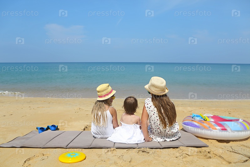 Счастливая девочка и ее сестры, играющие в песке на красивом пляже