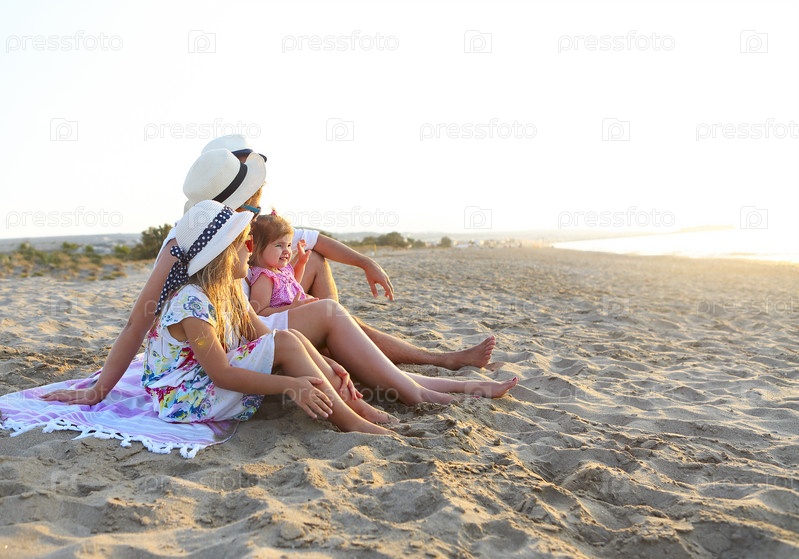 Смеющаяся семья с отцом, матерью, дочерьми, устраивающими пикник на пляже