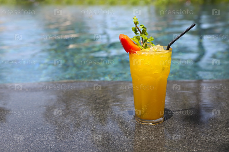 Коктейль Май Тай со светлым ромом, темным ромом, Апельсин Кюрасао, миндальным сиропом, лаймом, кубиками льда, ананасом и мятой у бассейна