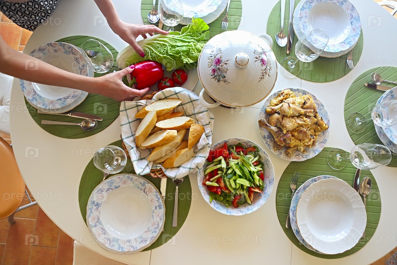 Закрыть стол рыбным супом, салатом и курицей