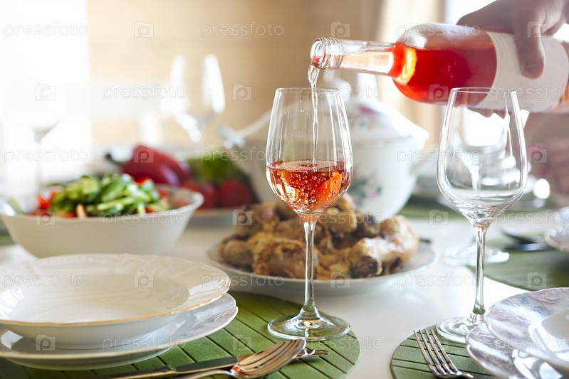 Стол с розовым вином, рыбным супом, салатом и курицей