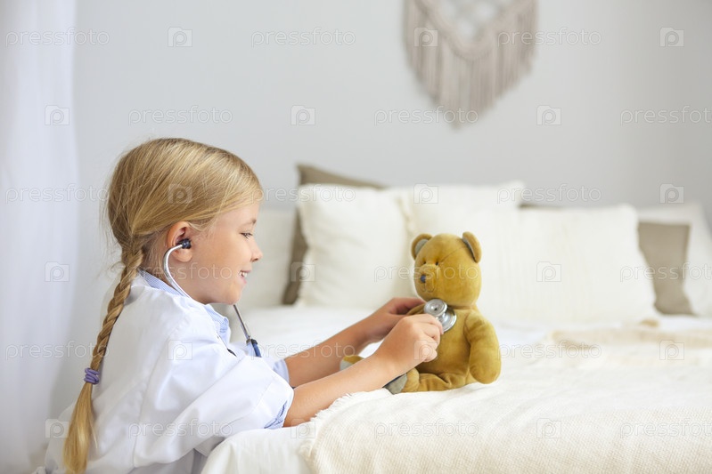 Маленькая блондинка со стетоскопом играет с плюшевым мишкой