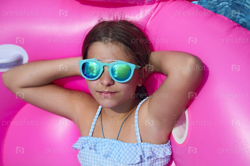 Портрет маленькой девочки в солнечных очках на надувном плавательном поплавке с фламинго