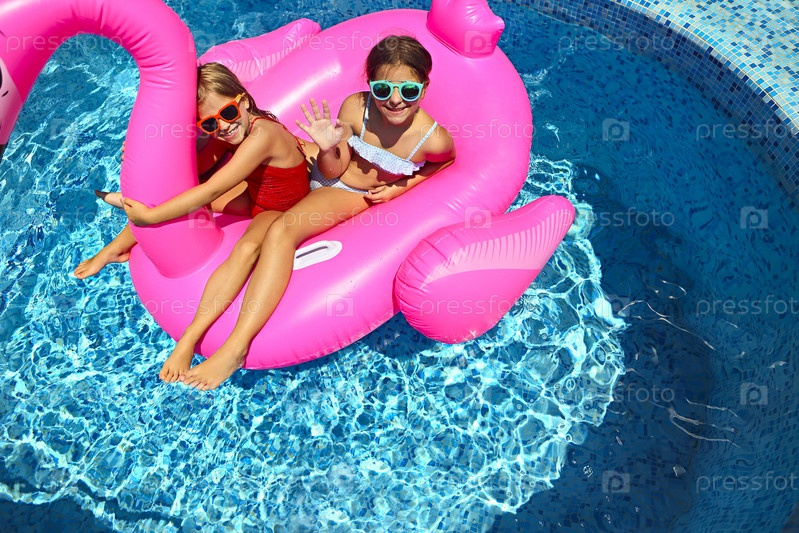 Портрет двух девушек в солнечных очках, счастливых друзей на надувном плавательном поплавке с фламинго