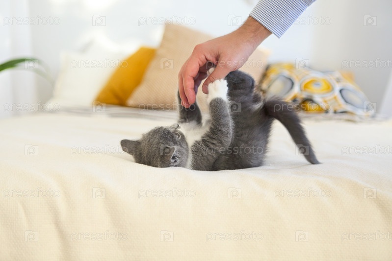 Котенок и мужчина. Кот на кровати и человеческая рука