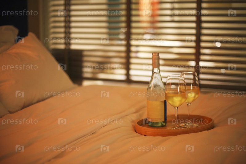 Два бокала белого вина в постели на размытом фоне