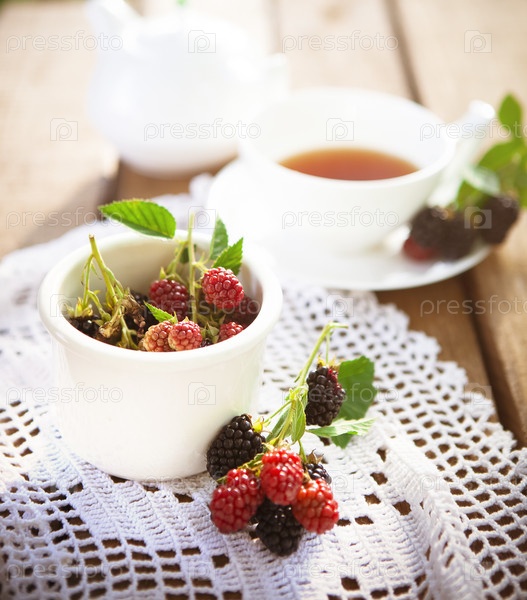 Свежие ягоды и чашка чая на столе