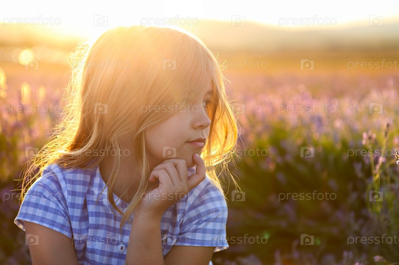 Счастливая блондинка с длинными волосами на закате в лавандовом поле