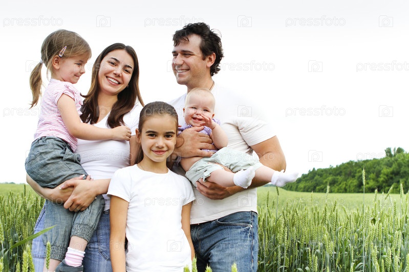 Веселая счастливая семья в пшеничном поле