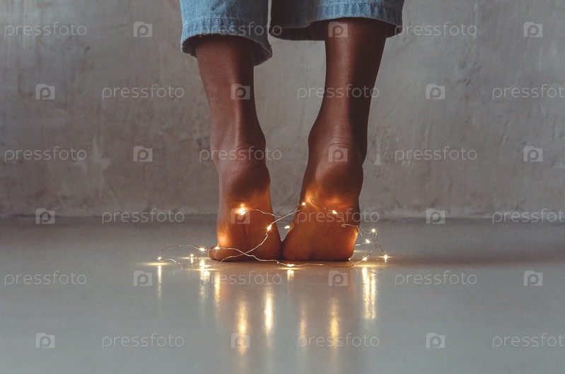 Праздничные яркие светодиодные фонари под босыми ногами африканской женщины, стоящей на цыпочках на ламинированном полу