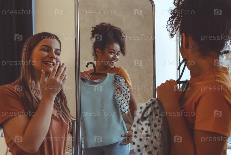 Две подруги весело примеряют одежду перед зеркалом дома, улыбающаяся афроамериканка держит платье на вешалке, показывая наряд подруге, стоящей рядом. Межрасовая дружба