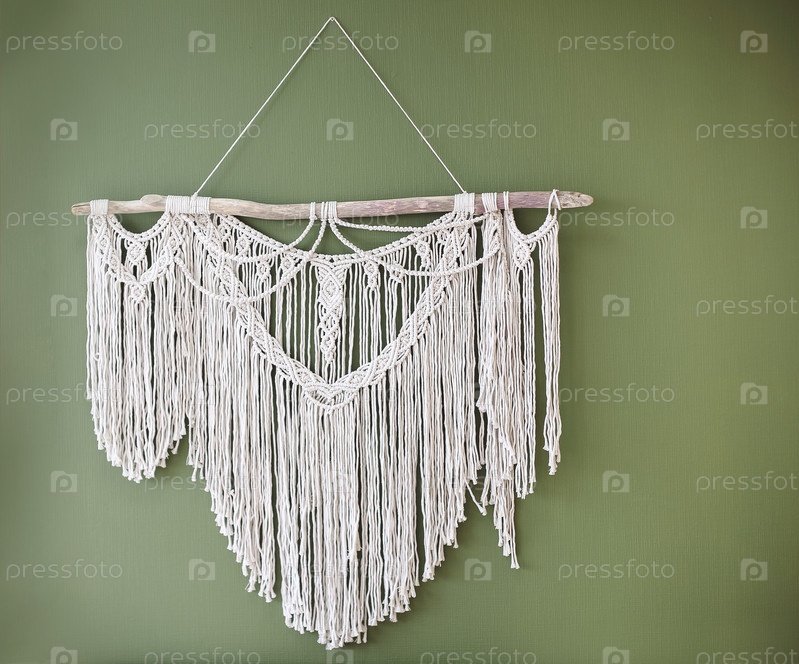 Белое украшение макраме ручной работы висит на зеленой стене, декоративный элемент в богемном стиле