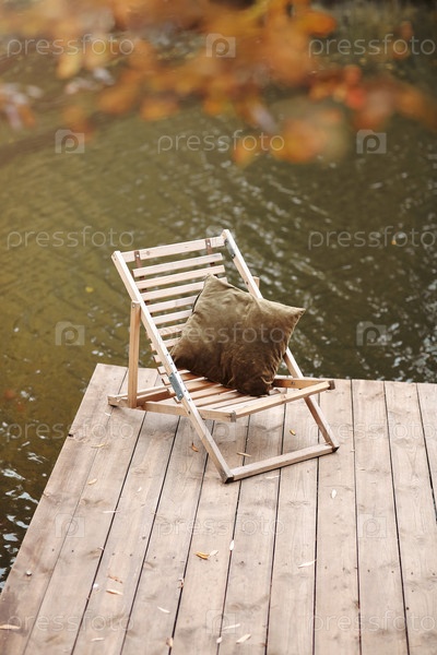 Пустой деревянный причал на спокойном озере в прохладный пасмурный осенний день с одиноким складным стулом