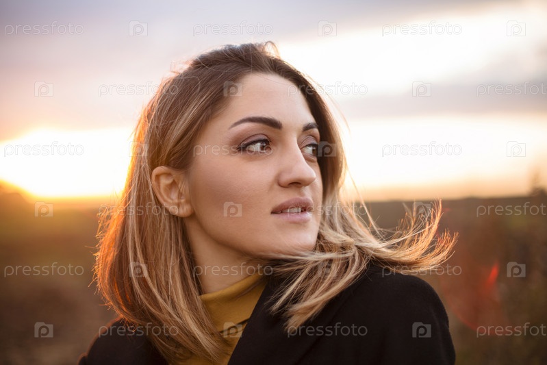 Молодая красивая женщина наслаждается природой, стоя в осеннем поле на закате