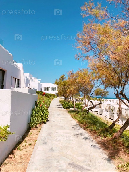 Пустая живописная улица с побеленными зданиями на берегу моря на современном курорте