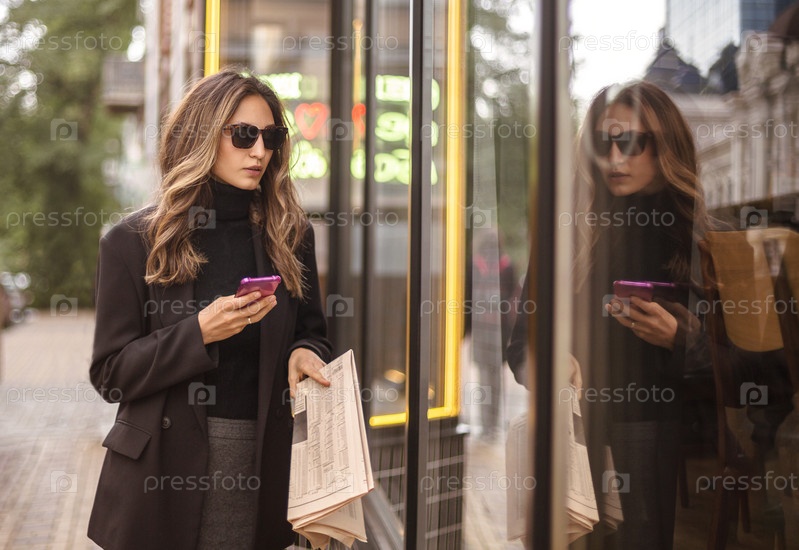 Молодая элегантная модная женщина смотрит в витрину магазина во время прогулки по городской улице в выходные