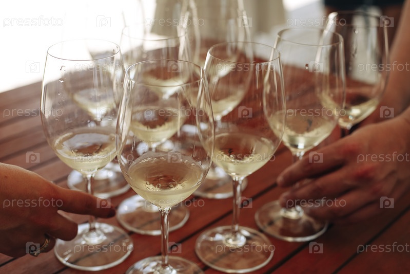Бокалы с разными видами вина и человеческие руки, держащие бокалы на заднем плане