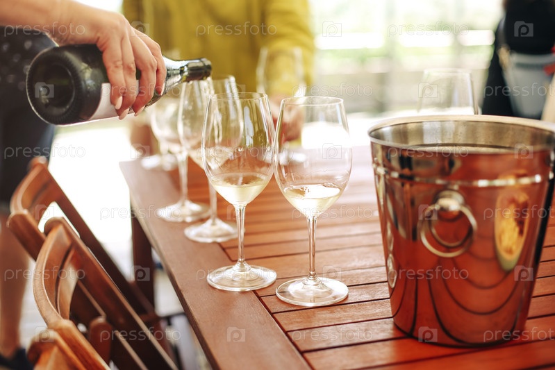 Бокалы с разными видами вина и человеческие руки, держащие бокалы на заднем плане