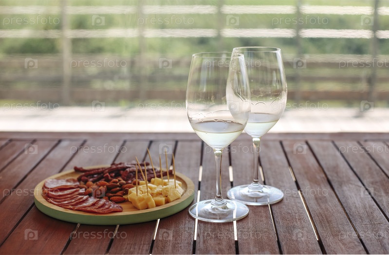 Обед со свежими закусками и белым вином подается на открытом воздухе на зеленом лугу