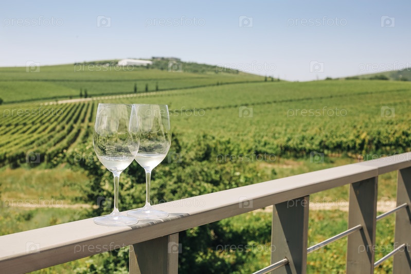 два бокала с белым вином на фоне виноградников