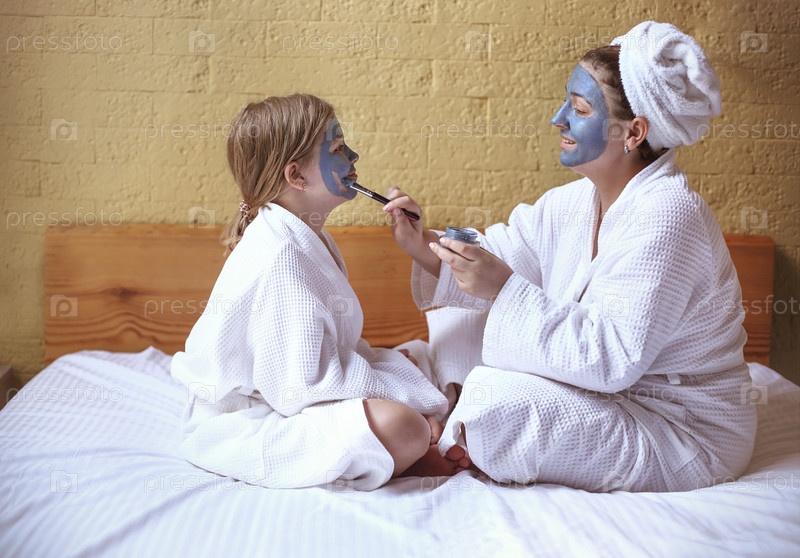 Счастливая семейная мать и маленькая дочь делают маску для лица
