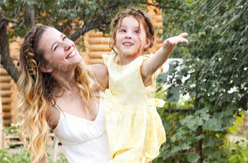 Красивая счастливая семья матери и маленькой дочери под летним дождем в зеленом саду