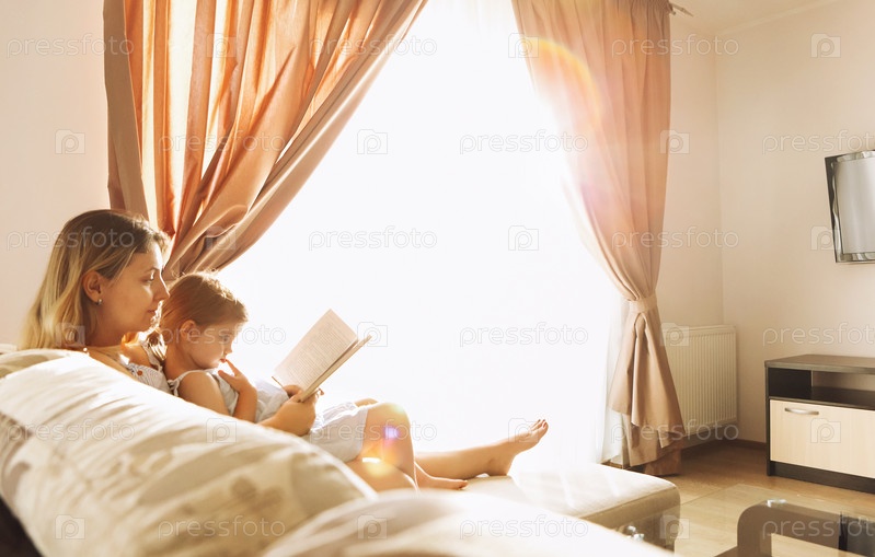 Расслабленная мать и маленькая девочка сидят вместе на уютном диване в гостиной с книгой в руках