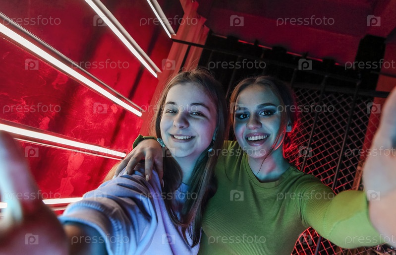 Две счастливые лучшие подруги молодые девушки на дискотеке позируют для фото