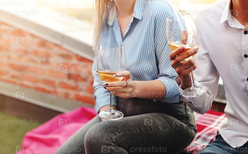 Красивая любящая пара, завернутая в одно одеяло, улыбается в камеру, молодой мужчина и женщина держат бокалы белого вина