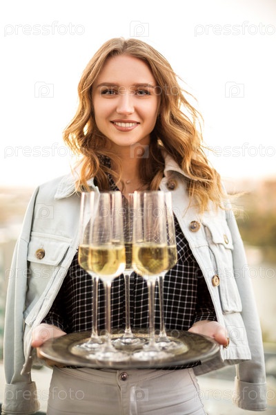 Молодая блондинка, улыбающаяся женщина, держащая поднос с шампанским игристым вином в бокалах флейты