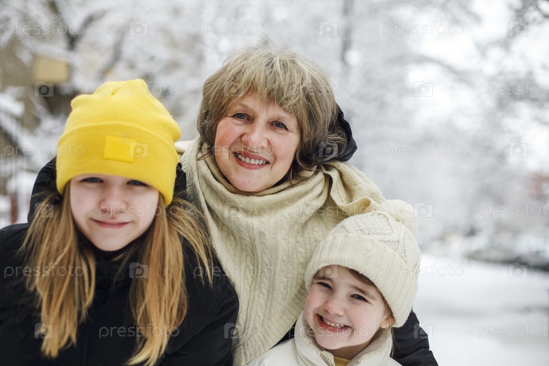 Радостная семейная бабушка с внуками в теплой одежде играет на свежем воздухе в зимнем парке