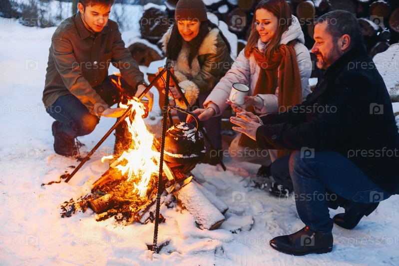 Группа друзей собирается у костра на заднем дворе, пьет чай и греет руки