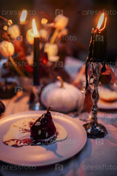 Выборочный фокус грушевого десерта с сабайоном, итальянский соус Zabaglione на тарелке, подаваемый за обеденным столом, оформленный в стиле Хэллоуина, с черными свечами, декоративными маленькими тыквами и сушеными цветами