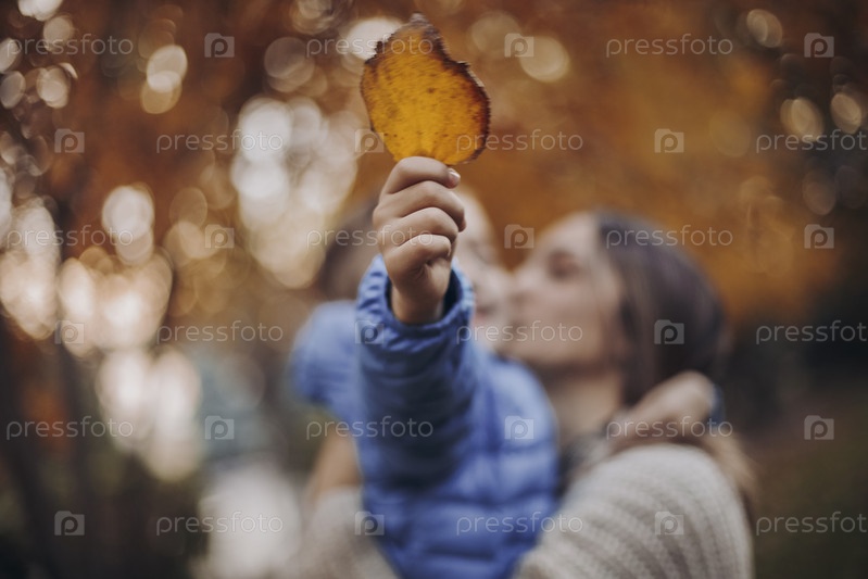Молодая счастливая семья, мать и маленький сын гуляют в осеннем лесу