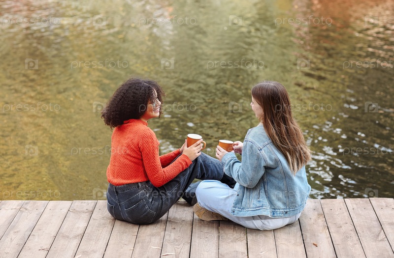 Две счастливые многорасовые подруги пьют чай и разговаривают, отдыхая у пруда в осенний день