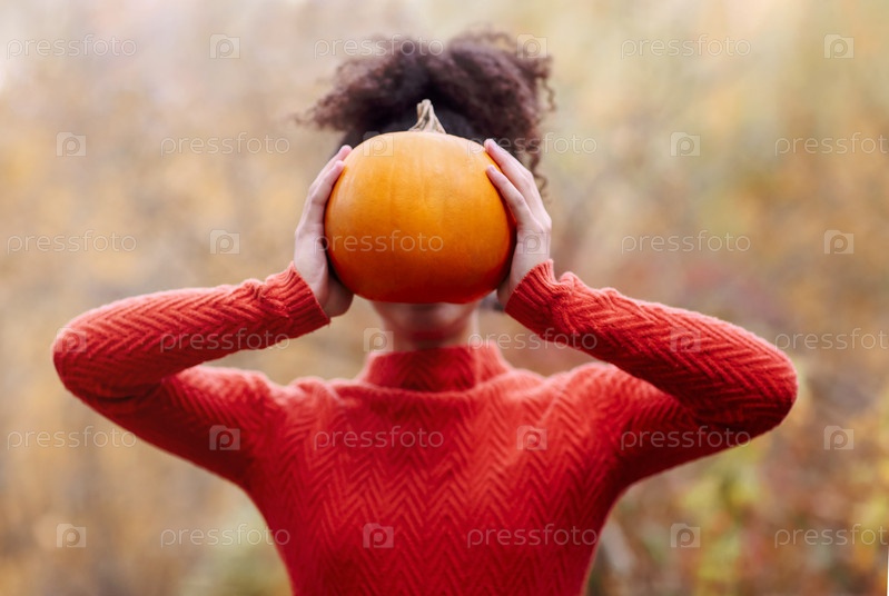 Молодая женщина смешанной расы с вьющимися волосами держит оранжевую тыкву, стоя в осеннем лесу
