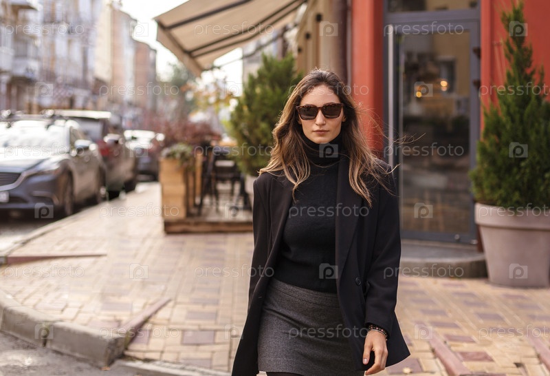 Молодая модная уверенная в себе женщина гуляет по городской улице на открытом воздухе