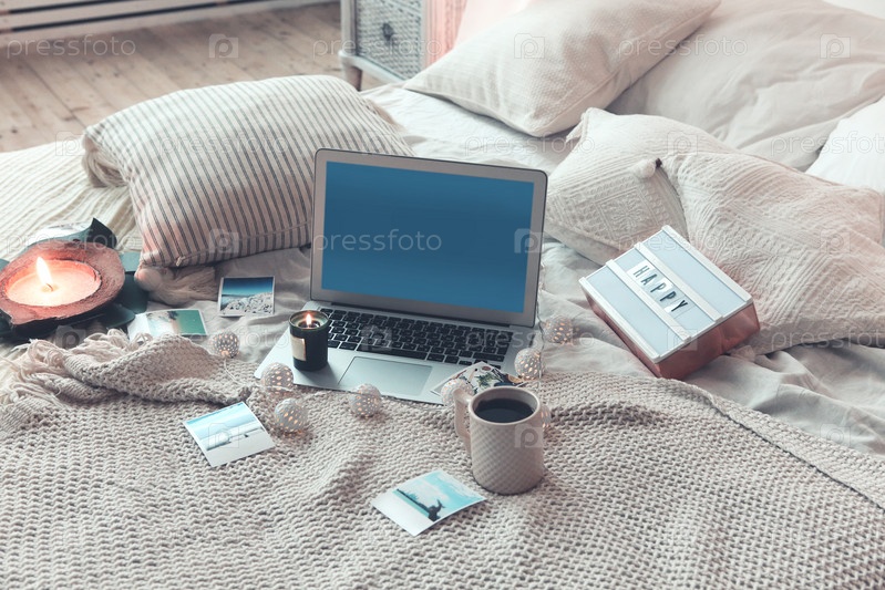 Фотографии поездки и горячий напиток возле ноутбука на кровати