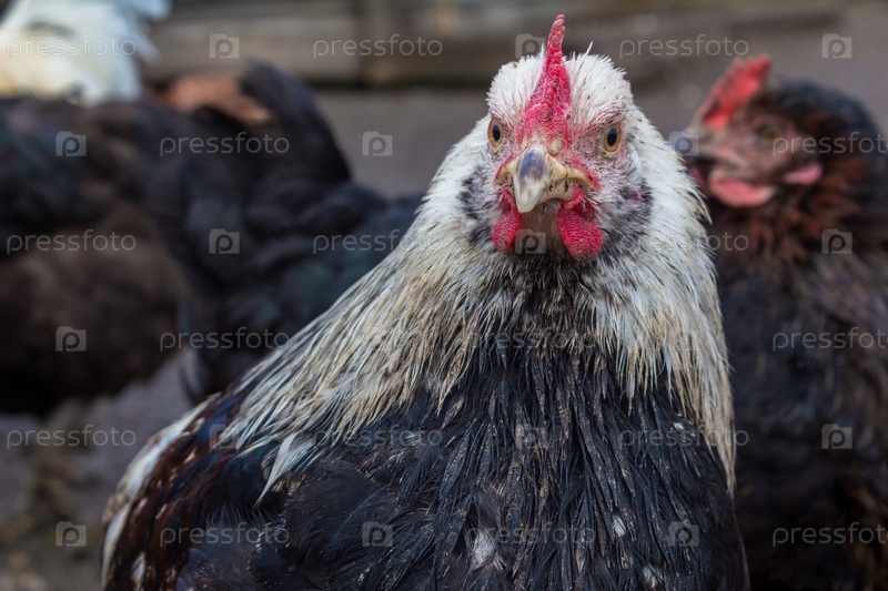 Черная курица с белыми перьями на голове крупным планом на фоне курятника