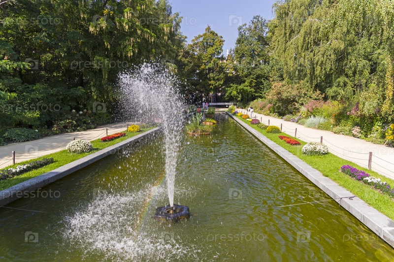 Радуга в брызгах фонтана. Солнечный день в сентябре. Москва, Аптекарский Огород (филиал ботанического сада МГУ)