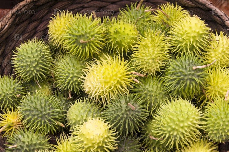 Корзина с плодами экзотического растения - дикий африканский огурец. Традиционная осенняя выставка плодов и овощей в Аптекарском Огороде (филиал ботанического сада МГУ). Москва