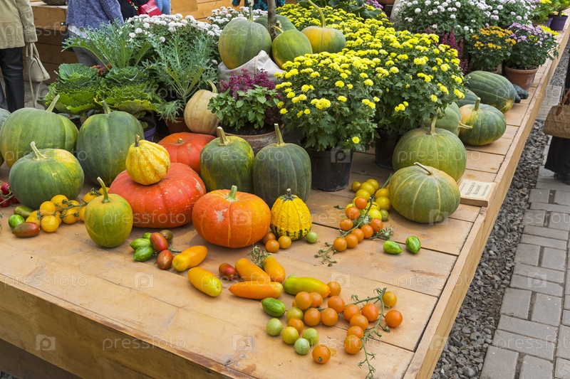 Композиция из тыкв и помидоров разнообразных форм и цветов на традиционной осенней выставке плодов и овощей в Аптекарском Огороде (филиал ботанического сада МГУ). Москва