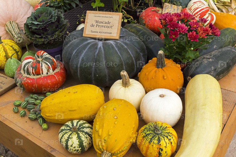 Композиция из тыкв разнообразных форм и цветов и размеров на традиционной осенней выставке плодов и овощей в Аптекарском Огороде (филиал ботанического сада МГУ). Москва