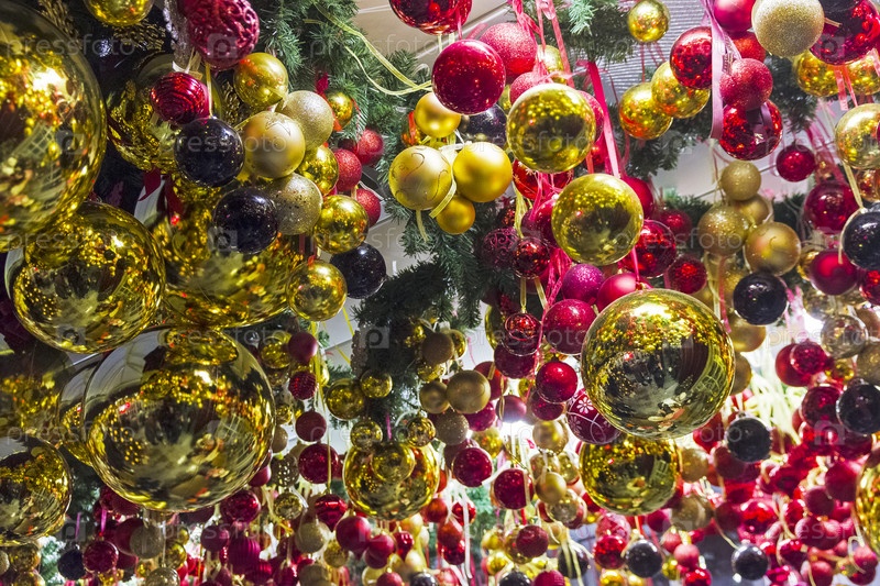 Новогоднее украшение интерьера - разноцветные стеклянные шарики, висящие под потолком
