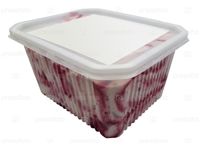 Ягодное мороженое в пластиковой коробке на белом фоне