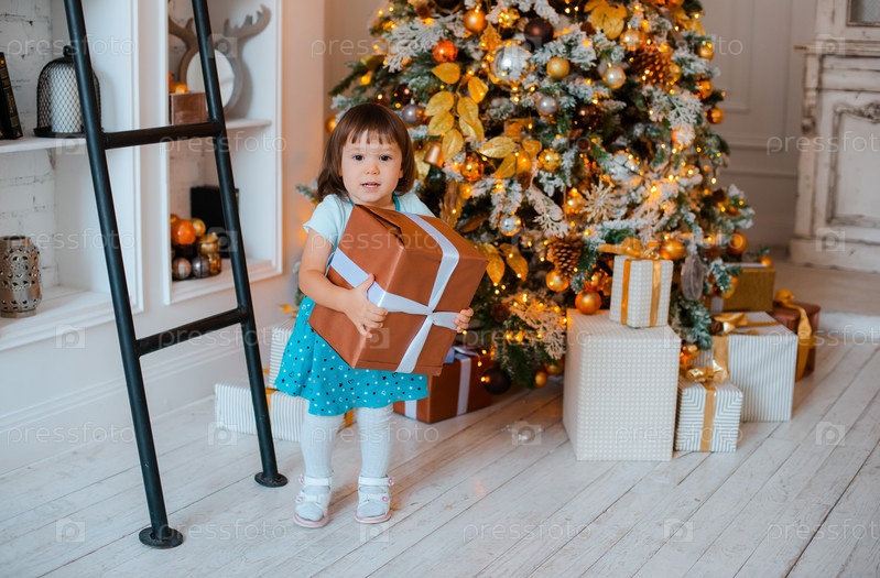 Милая маленькая девочка открывает подарок на рождество. Портрет счастливого малыша в канун Рождества
