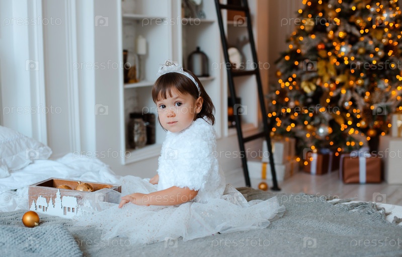 Маленькая девочка на фоне елки. Портрет счастливого ребенка в канун Рождества