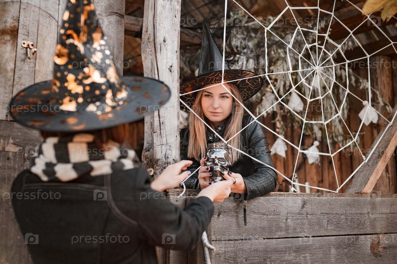 Две загадочные женщины в маскарадных костюмах ведьмы или волшебника на вечеринке в честь Хэллоуина в сельской местности