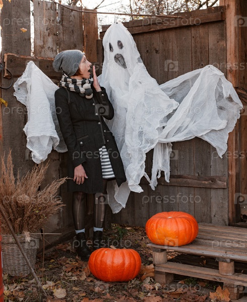 Испуганная молодая женщина в темной одежде смотрит на жуткого фальшивого призрака во дворе, украшенном на Хэллоуин
