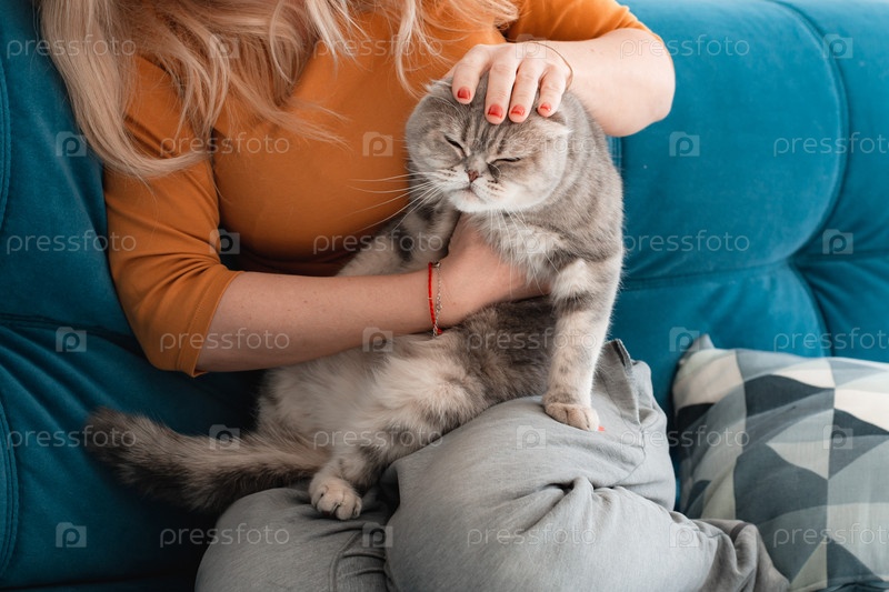 Портрет милой домашней чистокровной кошки, лежащей с хозяином дома